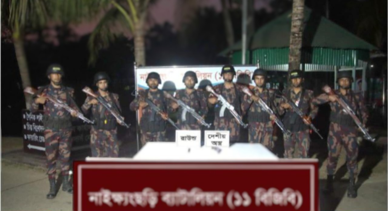 বুধবার ((১২ ফেব্রুয়ারি) সকাল ও বিকেলে পৃথক অভিযান চালিয়ে নাইক্ষ্যংছড়ি ব্যাটালিয়ন (১১ বিজিবি) এর অধিনায়কের নেতৃত্বে অধীনস্থ ভালুখাইয়া বিওপির দায়িত্বপূর্ণ এলাকায় রাবার বাগান নামক স্থান বিকেলে উদ্ধার করে মালিকবিহীন১টি দেশীয় অস্ত্র এবং ১ রাউন্ড গুলি। উদ্ধারকৃত অস্ত্র এবং গুলি নাইক্ষ্যংছড়ি থানায় হস্তান্তর ও পলাতক আসামিদের বিরুদ্ধে মামলার কার্যক্রম প্রক্রিয়াধীন আছে।