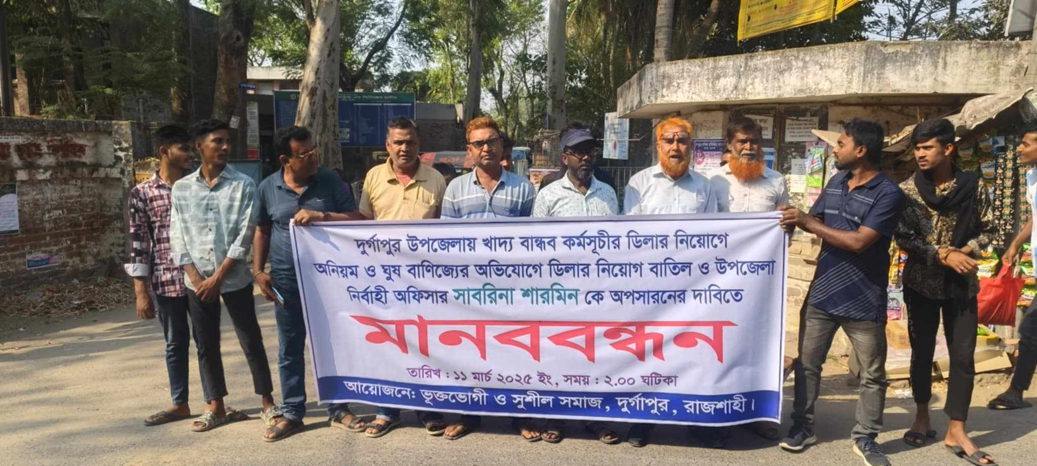 রাজশাহীর দূর্গাপুর উপজেলা নির্বাহী অফিসারের বিরুদ্ধে খাদ্য বান্ধব কর্মসূচির ডিলার নিয়োগে অনিয়ম ও ঘুষ বাণিজ্যের অভিযোগ উঠেছে। অনিয়ম দূর্নীতিসহ ডিলার নিয়োগ বাতিল ও উপজেলা নির্বাহী অফিসার সাবরিনা শারমিন'কে অপসারণের দাবিতে মানববন্ধন অনুষ্ঠিত হয়েছে। ১১ মার্চ (মঙ্গলবার) দুপুর দুই ঘটিকার সময় দূর্গাপুর উপজেলা স্বাস্থ্য কমপ্লেক্সের সামনে এ মানববন্ধন অনুষ্ঠিত হয়। মানববন্ধনে উপস্থিত ছিলেন, দূর্গাপুর উপজেলার ১নং নওপাড়া ইউনিয়নের নাফিস এন্টার প্রাইজ এর প্রোপাইটর সাব্দুল আলী জুয়েল, সিয়াম এন্টার প্রাইজের প্রোপাইটর আনিসুর রহমান, শ্যামপুর বাজার কেন্দ্রের প্রোপাইটর মোফাজ্জল হোসেন, মেসার্স অনু টেডার্স এর আফাজ উদ্দিন, ৬নং মাড়িয়া ইউপি এর মেসার্স সরকার এন্টার প্রাইজের, শামসুল হক সরকার, মেহেদী এন্টার প্রাইজ এর আঃ সালাম খন্দকার, ৭নং জয়নগর ইউনিয়নের মেসার্স হিমেল স্টোর এর মোস্তাফিজুর রহমান, ৪নং দেলোয়াবাড়ি ইউপি এর সাইদুর এন্টার প্রাইজের সাইদুর রহমান, ৫নং ঝালুকা ইউপি দুলাল এন্টার প্রাইজ এর মোঃ দুলাল, ৩নং পানানগর ইউনিয়ন এক লিটার এন্টার প্রাইজের জাহাঙ্গীর সহ বিভিন্ন ইউনিয়নের দলীয় নেতৃবৃন্দ, ভুক্তভোগী ও সুশীল সমাজের প্রতিনিধিরা উপস্থিত ছিলেন। মানববন্ধনে বক্তারা বলেন, দূর্গাপুরে খাদ্য বান্ধব কর্মসূচির ডিলার নিয়োগের সভাপতি উপজেলা নির্বাহী অফিসার সাবরিনা শারমিন, উপজেলা ফুড অফিসার মোহাম্মদ আলী, উপজেলা এলজিডি অফিসার মাসুক-ই-মোহাম্মদ, উপজেলা সমাজ সেবা অফিসার আ.ন.ম রাকিবুল ইউসুফ এর মাধ্যমে আমাদেরকে ডিলার নিয়োগ দিবে বলিয়া বড় বড় মাছ, খেজুরের গুড়,গরুর দুধ, ডিম,নিত্য প্রয়োজনীয় বাজার করে নিয়েছে। গত দুই সপ্তাহ পূর্বে ওই তিন কর্মকর্তা আমাদের বলেন, যেহেতু খাদ্য বান্ধব কর্মসূচির ডিলার নিয়োগের সভাপতি উপজেলা নির্বাহী অফিসার সাবরিনা শারমিন সেহেতু আপনাদেরকে মাথাপিছু ১ লক্ষ টাকা করে দিতে হবে বলে দাবি করেন। আমরা টাকা দিতে না পারার কারণে আমাদেরকে ডিলার নিয়োগ দেওয়া হয় নাই। আমরা ইতিমধ্যে উপজেলা নির্বাহী অফিসার সাবরিনা শারমিন এর কাছে খাদ্য বান্ধব কর্মসূচিরর অবৈধ ডিলার নিয়োগে বাতিলের জন্য লিখিত অভিযোগ করেছি এবং মানববন্ধনের মাধ্যমে জেলা প্রশাসকের কাছে ডিলার নিয়োগ অনিয়ম ও ঘুষ বাণিজ্য কারনে অবৈধ ডিলার নিয়োগ বাতিল করন ও উপজেলা নির্বাহী অফিসার সাবরিনা শারমিনকে অপসারণের দাবি জানিয়েছি।