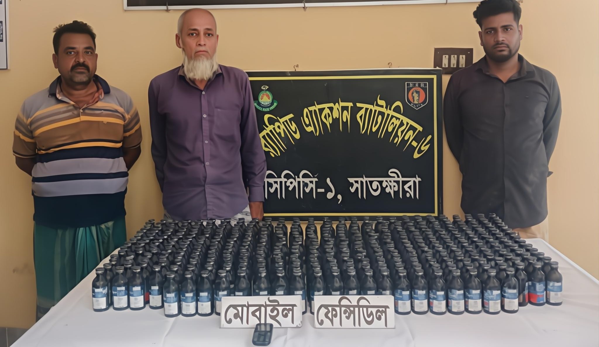 সাতক্ষীরার কালিগঞ্জ উপজেলার নলতায় র্যাবের অভিযানে ৩৯৮ বোতল ফেনসিডিলসহ তিনজনকে আটক করা হয়েছে। সোমবার সকালে উপজেলার নলতা বাজারের সানি মার্কেটের একটি দোকানে অভিযান চালিয়ে বিপুল পরিমাণ ফেনসিডিল উদ্ধার করে র্যাব-৬ এর একটি চৌকস দল। র্যাব-৬ সাতক্ষীরা ক্যাম্পের কোম্পানি কমান্ডার অতিরিক্ত পুলিশ সুপার রেজাউল হক জানান, ভারত থেকে অবৈধ পথে আসা ফেনসিডিল ঢাকায় পাচার করা হবে এমন গোপন সংবাদের ভিত্তিতে সোমবার সকাল সাড়ে সাতটার দিকে অভিযান চালানো হয়। অভিযানে সানি মার্কেটের দ্বিতীয় তলায় অবস্থিত ব্যবসা প্রতিষ্ঠান থেকে বস্তাভর্তি ৩৯৮ বোতল ফেনসিডিল উদ্ধার করা হয়। অভিযানে আটককৃতরা হলেন মাদক ব্যবসায়ি জাহাঙ্গীর হোসেন (৩৮), তিনি কালীগঞ্জ উপজেলার ব্রজপাটুলি গ্রামের বাসিন্দা; কেয়ারটেকার আব্দুল গফফার (৬২), তিনি খামারপাড়া গ্রামের আব্দুল হামিদের ছেলে; এবং নৈশ প্রহরী অমল সরকার (৫৫), যিনি শীতলপুর গ্রামের রণজিৎ সরকারের ছেলে। আটকদের কাছ থেকে তিনটি মোবাইল ফোন জব্দ করা হয়েছে। এ ঘটনায় র্যাব সদস্য ডিএডি হাবিবুর রহমান বাদী হয়ে সাতক্ষীরা সদর থানায় মাদকদ্রব্য নিয়ন্ত্রণ আইনে একটি মামলা দায়ের করা হয়েছে বলে জানা গেছে।