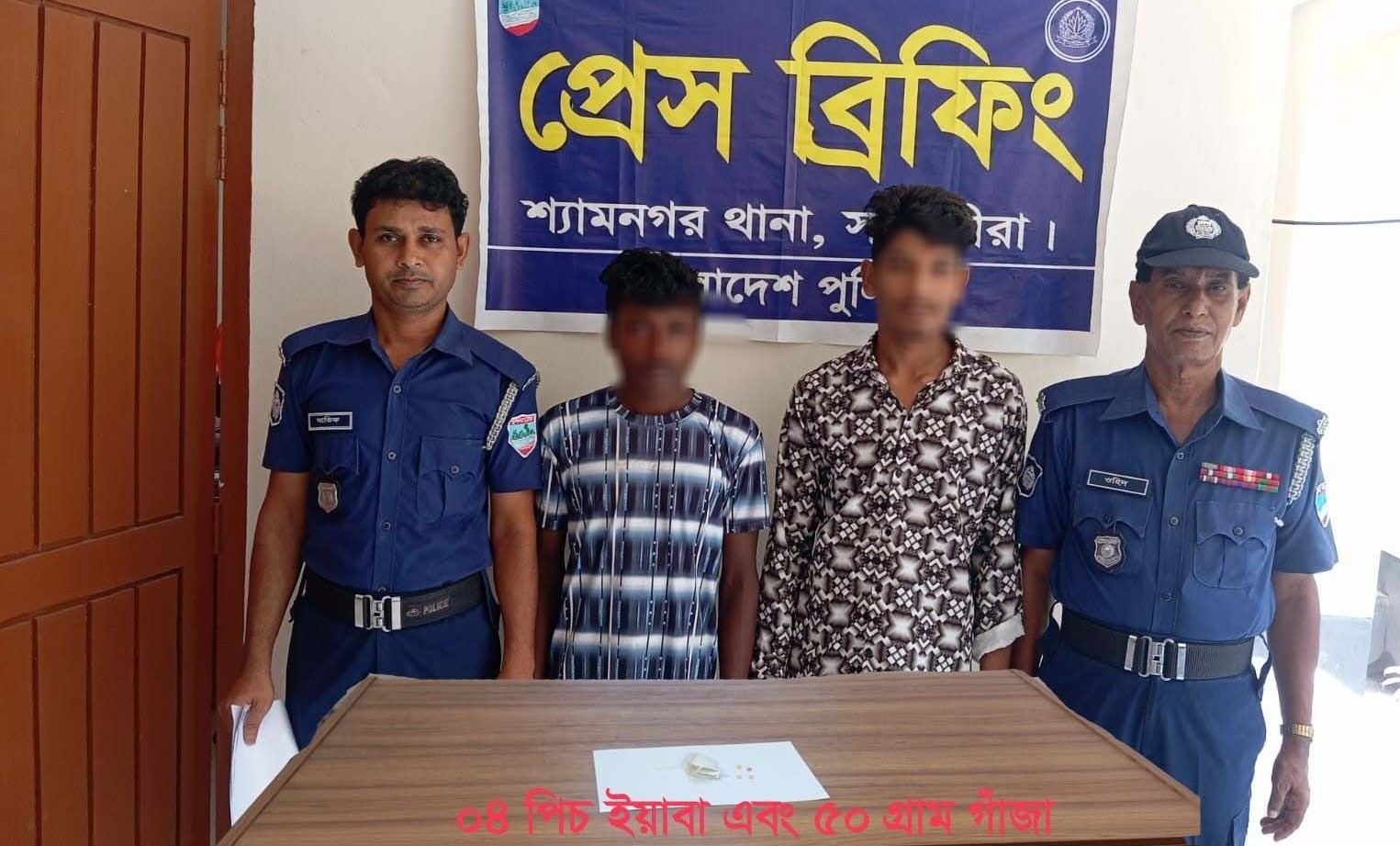 সাতক্ষীরা জেলার পুলিশ সুপার মোহাম্মদ মনিরুল ইসলামের দিক নির্দেশনায় এবং মোঃ হুমায়ূন করিব মোল্লা, অফিসার ইনচার্জ, শ্যামনগর থানার নেতৃত্বে ০২/০৭/২০২৫ রাত্র ২৩.৩০ ঘটিকার সময় এসআই(নিঃ) মোহাম্মাদ বিপ্লব হোসেন সঙ্গীয় ফোর্স সহ মাদকবিরোধী অভিযান পরিচালনাকালে শ্যামনগর থানাধীন আটুলিয়া ইউনিয়নের নওয়াবেঁকী ওয়াপদা রোডস্থ জনৈক সাঈদ এর চায়ের দোকানের সামনে পাঁকা রাস্তার উপর হইতে ০৪ পিচ ইয়াবা ট্যাবলেট এবং ৫০গ্রাম গাঁজা সহ আসামী ১। মোঃ রনি(২১) গ্রেফতার পিতা-মোঃ কামরুল ইসলাম, মাতা-রেহানা খাতুন, সাং-পশ্চিম বিড়ালক্ষী, ২। শান্ত মন্ডল(২০), পিতা-মৃত বাবু মন্ডল, মাতা-শিলা রানী, সাং-নকিপুর (জমিদার বাড়ির পাশে) উভয়থানা-শ্যামনগর, জেলা-সাতক্ষীরাদ্বয় কে গ্রেফতার করেন আসামীর বিরুদ্ধে শ্যামনগর থানার মাদকদ্রব্য নিয়ন্ত্রন আইন, মামলা দায়ের করে আসামীদ্বয় কে বিজ্ঞ আদালতে সোপর্দ্দ করা হয়েছে বলে জানা গেছে।