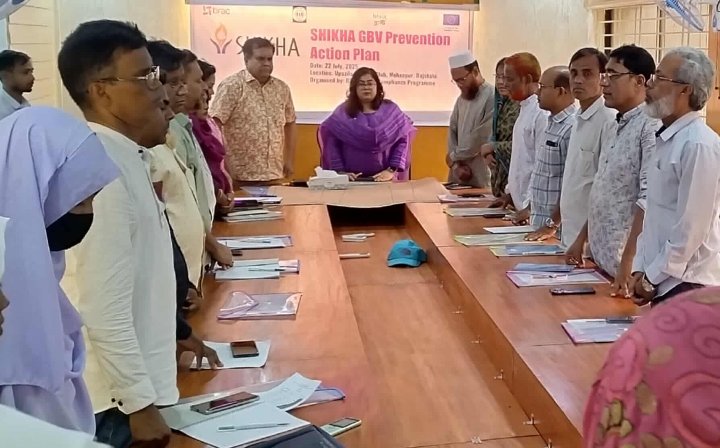 ব্র্যাকের ‘শিখা’ প্রকল্পের আওতায় রাজশাহীর মোহনপুর উপজেলার মাধ্যমিক বিদ্যালয়গুলোতে জেন্ডার ভিত্তিক সহিংসতা প্রতিরোধে (জিবিভি) উপজেলা পর্যায়ের কর্মপরিকল্পনা সভা অনুষ্ঠিত হয়েছে। মঙ্গলবার (২২ জুলাই) সকালে উপজেলার নতুন সেমিনার কক্ষে সভাটি অনুষ্ঠিত হয়। উপজেলা শিক্ষা কর্মকর্তা এস এম হাসান মাহমুদ এর সভাপতিত্বে প্রধান অতিথি ছিলেন উপজেলা নির্বাহী কর্মকর্তা (ইউএনও) আয়শা সিদ্দিকা। ব্র্যাকের ‘শিখা’ প্রকল্পের প্রজেক্ট অফিসার সাবির হোসেনের সঞ্চালনায় শুভেচ্ছা বক্তব্য প্রদান করেন ‘শিখা’ প্রকল্পের জেলা টেকনিক্যাল ম্যানেজার মিতা সরকার।বিশেষ অতিথি হিসেবে আরো উপস্থিত ছিলেন, উপজেলা একাডেমিক সুপারভাইজার, শিখা প্রকল্পের নির্ধারিত মাধ্যমিক বিদ্যালয়ের প্রধান শিক্ষক, সহকারী শিক্ষক, স্কুল ম্যানেজমেন্ট কমিটির সদস্যবৃন্দ ছাড়াও অনুষ্ঠানে শিক্ষার্থীরা উপস্থিত ছিলেন। সভায় প্রধান অতিথি উপজেলা নির্বাহী কর্মকর্তা (ইউএনও) আয়শা সিদ্দিকা বলেন, নারী ও শিশুদের প্রতি যৌন হয়রানি, শিক্ষা প্রতিষ্ঠানে লিঙ্গ ভিত্তিক সহিংসতা প্রতিরোধ, বুলিং এবং বাল্যবিবাহ সমাজের জন্য একটি বড় চ্যালেঞ্জ। এসব অপরাধ প্রতিরোধে স্কুল পর্যায় থেকেই সচেতনতা ও প্রতিরোধ গড়ে তুলতে হবে। এবিষয়ে বড় ভুমিকা পালক করবে শিখা প্রকল্প। তাই আমরা তাদেরকে সার্বিক সহযোগীতা প্রদান করবো। শিখা’ প্রকল্পটি ইউরোপীয় ইউনিয়নের অর্থায়নে পরিচালিত চার বছর মেয়াদী একটি উদ্যোগ, যা ২০২৫ সালের ফেব্রুয়ারি থেকে ২০২৯ সালের জানুয়ারি পর্যন্ত বাস্তবায়িত হবে। রাজশাহীসহ দেশের ছয়টি জেলা ঢাকা, গাজীপুর, চট্টগ্রাম, নারায়ণগঞ্জ, বরিশালে এই প্রকল্পের কার্যক্রম চলমান।প্রকল্পের মূল লক্ষ্য হল শিক্ষা প্রতিষ্ঠান, গণপরিবহন, তৈরি পোশাক কারখানা ও অনলাইন প্ল্যাটফর্মে নারীদের প্রতি যৌন হয়রানি ও লিঙ্গভিত্তিক সহিংসতা প্রতিরোধে শক্তিশালী ব্যবস্থা গড়ে তোলা। এ উপলক্ষে পুঠিয়া উপজেলায় ৯ স্কুলসহ রাজশাহীতে ৬০টি শিক্ষা প্রতিষ্ঠান ও কর্মক্ষেত্রে সচেতনতা এবং সহায়তা কর্মসূচি চালানো হবে। সভায় শিক্ষকমণ্ডলী, সাংবাদিক এবং ব্র্যাক প্রতিনিধিরা যৌন হয়রানি ও বুলিং প্রতিরোধে করণীয় বিষয়ে গবেষণালব্ধ তথ্যের আলোকে আলোচনা করেন এবং একটি সমন্বিত কর্মপরিকল্পনা প্রণয়ন করেন।‘শিখা’ প্রকল্পের মাধ্যমে স্থানীয় সরকার, জনপ্রতিনিধি, সুশীল সমাজ ও স্থানীয় সংগঠনগুলোকে সম্পৃক্ত করে সমাজে জেন্ডারভিত্তিক সহিংসতা প্রতিরোধে সচেতনতা, আইনি সহায়তা ও প্রাতিষ্ঠানিক কাঠামো শক্তিশালী করার লক্ষ্যে কাজ করা হবে বলে জানানো হয়। উল্লেখ্য, সভা চলাকালীন গতকালের মাইলস্টোন স্কুলে বিমান দুর্ঘটনায় জাতীয় শোক পালনে এক মিনিট নিরবতা প