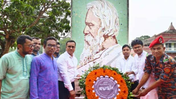 কুমারখালীতে রবীন্দ্রনাথ ঠাকুরের ৮৪তম প্রয়াণ দিবস পালন কবিগুরু রবীন্দ্রনাথ ঠাকুরের ৮৪তম প্রয়াণ দিবস উপলক্ষ্যে কুষ্টিয়ার কুমারখালীতে কবির প্রতিকৃতিতে পুষ্পস্তবক অর্পণ, আলোচনা সভা ও সাংস্কৃতিক অনু্ষ্ঠান অনু্ষ্ঠিত হয়েছে। বৃহস্পতিবার (৭ আগষ্ট) বিকেলে উপজেলার শিলাইদহে স্মৃতিবিজড়িত রবীন্দ্র কুঠিবাড়ী চত্বরে বিশ্বকবির প্রতিকৃতিতে পুষ্পস্তবক অর্পণ করা হয়। পরে বকুলতলায় আলোচনা সভা ও সাংস্কৃতিক অনুষ্ঠানের আয়োজন করে উপজেলা প্রশাসন। অনু্ষ্ঠানে প্রধান অতিথির বক্তব্য রাখেন উপজেলা নির্বাহী কর্মকর্তা এম এম মিকাইল ইসলাম। শিলাইদহের রবীন্দ্র কুঠিবাড়ির কাস্টোডিয়ান আল আমীনের সভাপতিত্বে অনুষ্ঠানে বিশেষ অতিথির বক্তব্য দেন উপজেলা সহকারী কমিশনার (ভূমি) বিজয় কুমার জোয়ার্দার, কুষ্টিয়া ইসলামী বিশ্ববিদ্যালয়ের বাংলা বিভাগের অধ্যাপক ড.তিয়াশা চাকমা। রবীন্দ্রনাথের জীবন, দর্শন ও সাহিত্যকর্মের উপর আলোচনা করেন কুষ্টিয়া ইসলামী বিশ্ববিদ্যালয়ের বাংলা বিভাগের অধ্যাপক ড. মো. রশিদুজ্জামান। এদিকে কবিগুরুর জন্মবার্ষিকী জাতীয় ও আরম্ভরপূর্ণ ভাবে পালিত হয়। তবে প্রয়াণ দিবসটি উপলক্ষে কবিগুরুর স্মৃতিবিজড়িত কুঠিবাড়িতে জাতীয়ভাবে কোনো আয়োজন না থাকায় ক্ষোভ প্রকাশ করেছেন স্থানীয় ও রবীন্দ্র ভক্তরা। বিকেলে সরেজমিন গিয়ে দেখা যায়, অনেকটা অনেকটা সুনসান নিরোবতা। হাতে গুণা গুটিকয়েক দর্শনার্থী ও ভক্তরা এসেছেন বিভিন্ন এলাকা থেকে। এসময় কুমারখালী প্রেসক্লাবের সভাপতি কে এম আর শাহীন বলেন, জন্মবার্ষিকীতে জাতীয়ভাবে আরাম্ভরপূর্ণ তিন দিনব্যাপী আয়োজন করা হয়ে থাকে। তখন দেশ বিদেশ থেকে হাজার হাজার ভক্তবৃন্দর পদচারণায় মুখরিত থাকে কুঠিবাড়ি। তবে প্রয়াণ দিবসে অনেকটায় ভাটা পড়ে থাকে। প্রয়াণ দিবসও জাতীয়ভাবে পালনের দাবি জানান তিনি। প্রয়াণ দিবসের অনু্ষ্ঠানে সংগীত পরিবেশন করতে এসেছে কুমারখালী সরকারী বালিকা বিদ্যালয়ের দশম শ্রেণির ছাত্রী লুকাইবা রশিদ আনিনা বলে, কবিগুরুর জন্মবার্ষিকীর অনু্ষ্ঠানের মতো প্রয়াণ দিবসেও গান করতে এসেছি। তবে প্রয়াণ দিবসে থাকেনা তেমন আয়োজন। এটিও জাতীয়ভাবে পালন করা উচিৎ। কবিগুরুর ৮৪ তম প্রয়াণ দিবস উপলক্ষে প্রতিকৃতিতে পুষ্পস্তবক অর্পণ, আলোচনা সভা, গান, কবিতা ও নৃত্যানুষ্ঠানের আয়োজন করা হয়েছে বলে জানিয়েছেন রবীন্দ্র কু্ঠিবাড়ির কাস্টোডিয়ান আল আমীন। উপজেলা নির্বাহী কর্মকর্তা এস এম মিকাইল ইসলাম বলেন, জন্মবার্ষিকীর ন্যায় প্রয়াণ দিবসটিও জাতীয়ভাবে পালনের জন্য উর্ধ্বতন কর্তৃপক্ষকে জানানো হবে।