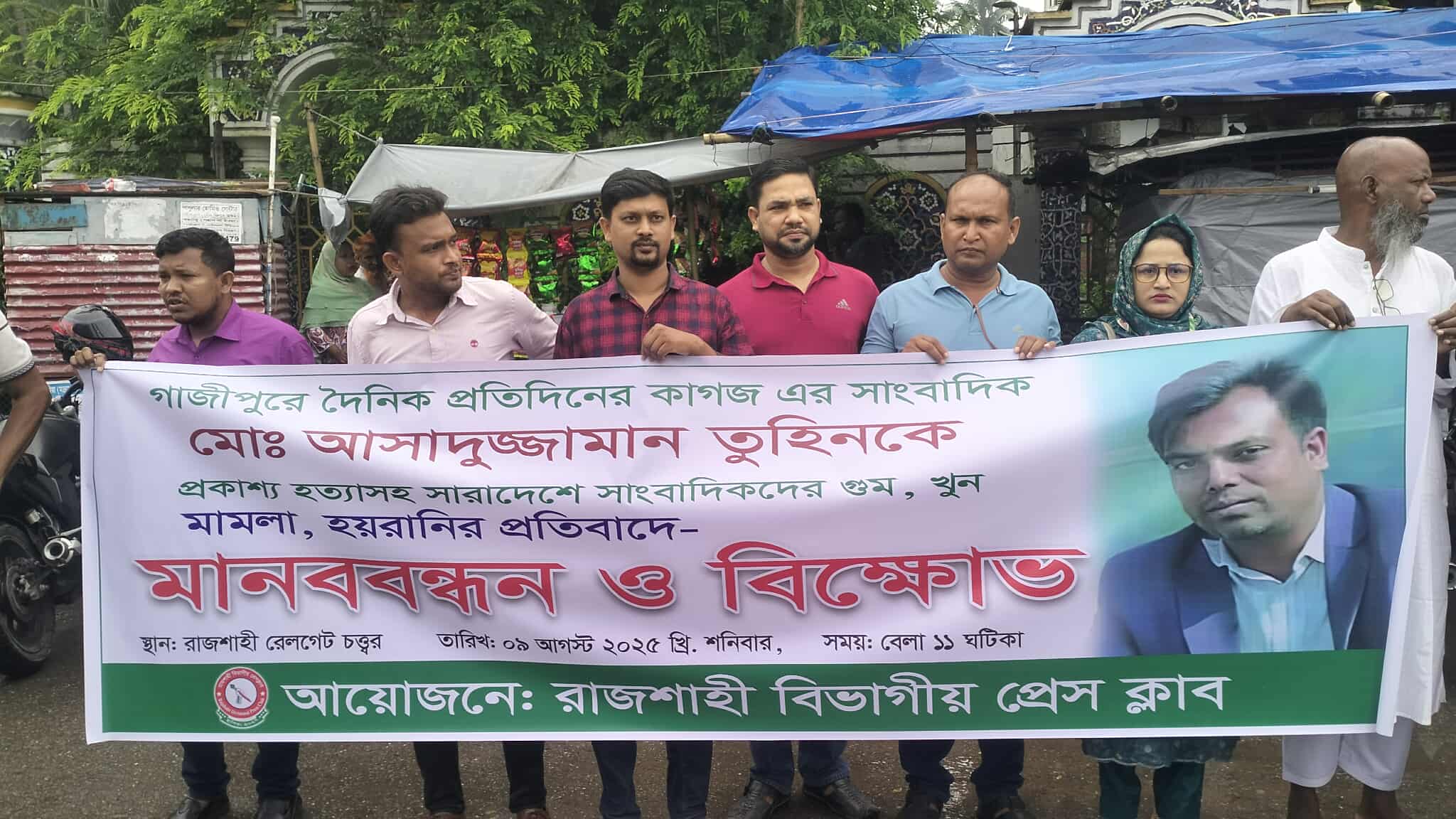গাজীপুরে প্রতিদিনের কাগজ’ পত্রিকার সাংবাদিক মো. আসাদুজ্জামান তুহিন হত্যা ও বাংলাদেশের আলো পত্রিকার আনোয়ার হোসেনের উপর হামলা নির্যাতনের প্রতিবাদে রাজশাহীতে দুই স্থানে মানববন্ধন ও বিক্ষোভ মিছিল অনুষ্ঠিত হয়েছে। শনিবার বেলা ১১টায় নগরীর রেলগেট চত্ত্বরে রাজশাহী বরেন্দ্র প্রেসক্লাবের উদ্যোগে প্রথম মানববন্ধন কর্মসূচি হয়। এতে রাজশাহী বিভাগীয় প্রেসক্লাব, রাজশাহী অনলাইন সাংবাদিক ফোরাম, বাংলাদেশ সাংবাদিক সংস্থা ও জাতীয় সাংবাদিক সংস্থার ব্যানারে শতাধিক সাংবাদিক অংশ নেন। মানববন্ধন শেষে বিক্ষোভ মিছিল বের হয়। বিক্ষোভ মিছিলটি রেলগেট থেকে নিউমার্কেট হয়ে নগরীর জিরোপয়েন্টে গিয়ে শেষ হয়। দুপুর ১২ টায় রাজশাহী প্রেসক্লাবের উদ্যোগে সাহেব বাজার জিরো পয়েন্টে দ্বিতীয় মানববন্ধন অনুষ্ঠিত হয়। সেখানে রাজশাহী প্রেসক্লাবের সঙ্গে একাত্মতা ঘোষণা করেন রাজশাহী বরেন্দ্র প্রেসক্লাব, রাজশাহী বিভাগীয় প্রেসক্লাব, অনলাইন সাংবাদিক ফোরাম, বাংলাদেশ সাংবাদিক সংস্থা ও জাতীয় সাংবাদিক সংস্থা। এছাড়াও রাজশাহীর সিনিয়র সাংবাদিকরা উক্ত মানববন্ধনে অংশ নেয়। উভয় কর্মসূচিতেই গাজীপুরে সাংবাদিক তুহিন হত্যার দ্রুত বিচার এবং সাংবাদিকদের নিরাপত্তা নিশ্চিতের দাবি জানানো হয়। মানববন্ধনে বক্তারা বলেন, তুহিন হত্যাকাণ্ড শুধুমাত্র একজন সাংবাদিকের মৃত্যু নয়, এটি দেশের গণমাধ্যমের ওপর ভয়ংকর আঘাত। তারা আরও বলেন, আমরা জীবনের ঝুঁকি নিয়ে সত্য প্রকাশ করি, অথচ আমাদের নিরাপত্তার কোনো নিশ্চয়তা নেই—এটি মেনে নেওয়া যায় না। সরকারকে অবিলম্বে সাংবাদিক সুরক্ষা আইন বাস্তবায়ন করতে হবে, যাতে আর কোনো তুহিনকে প্রাণ হারাতে না হয়। সাংবাদিক নেতারা দাবি জানান, তুহিন হত্যাকারীদের দ্রুত গ্রেপ্তার করে দৃষ্টান্তমূলক শাস্তি দিতে হবে, যাতে ভবিষ্যতে কেউ সাংবাদিকদের ওপর হামলার সাহস না পায়। তারা আরও বলেন, গণতন্ত্র টিকিয়ে রাখতে মুক্ত গণমাধ্যম অপরিহার্য। সাংবাদিকদের ওপর হামলা মানে জনগণের কণ্ঠরোধ করা।সাংবাদিকদের নিরাপত্তা নিশ্চিত না হওয়া পর্যন্ত আমরা রাজপথ ছাড়ব না। এ সময় রাজশাহীর বিভিন্ন পত্রিকা, অনলাইন নিউজ পোর্টাল, টেলিভিশন ও পত্রিকার সাংবাদিকরা একত্রিত হয়ে তুহিন হত্যার তীব্র নিন্দা ও প্রতিবাদ জানান।