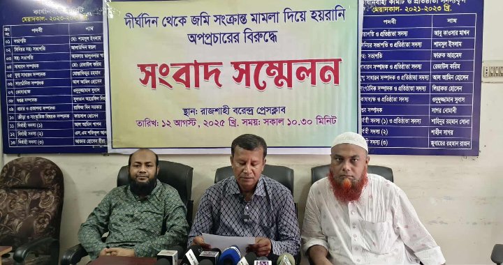 দীর্ঘদিন জমি সংক্রান্ত মামলা দিয়ে হয়রানি, আ: লীগের ক্ষমতার দাপট দেখানো, সর্বশেষ ফেসবুকে অপপ্রচার করে হয়রানি করার প্রতিবাদ ও বিচার চেয়ে সংবাদ সম্মেলন করেছে ভূক্তভোগীরা। মঙ্গলবার (১২ আগষ্ট) সকাল সাড়ে ১০ টায় রাজশাহী বরেন্দ্র প্রেসক্লাবে এ সংবাদ সম্মেলনেের আয়োজন করেন ভূক্তভোগী মুক্তার হোসেন। ভূক্তভোগী মুক্তার হোসেন রাজপাড়া থানার বসুয়া এলাকার ইনসান উদ্দিন’ ছেলে সংবাদ সম্মেলনে লিখিত বক্তব্য পাঠ করেন। লিখিত বক্তব্যে তিনি বলেন, আমার ক্রয় সুত্রে বসুয়া মৌজার সম্পত্তি, যাহার দাগ নম্বর ৪৩৫, আর এস খতিয়ান নম্বর ২৫০। ওই সম্পত্তিতে আমি ও আমার ছোট ভাই সাখাওয়াত হোসেন ওরফে সুকতার হোসেন দীর্ঘদিন যাবৎ বসবাস করে আসছি। সম্প্রতি আমার বাড়ির সামনে বিল্ডিং প্লাস্টার করার জন্য নিজ দাগের সম্পত্তির উপর সিমেন্ট বালু মেশাচ্ছিলাম। হঠাৎ মৃত: মহসিনের মেয়ে ফিরোজা তার বোনসহ প্রায় ১ কি:মি দূর থেকে এসে আমার কাজে বাধা দেয় ও সুকৌশলে ভিডিও ধারণ করেন। আমি ভিডিও’র বিষয়ে অবগত ছিলাম না। তারা আ’লীগ পরিবার। হড়গ্রাম ইউনিয়নের ৯ নং ওয়ার্ড আ’লীগের সাংগঠনিক সম্পাদক ছিল তার ভাই আতাউর। তার আরেক ভাই আসলাম উদ্দিন আ’লীগের মামলায় সম্প্রতি জেল থেকে বের হয়েছেন। আসলাম ও আতাউরের বিরুদ্ধে ৫ আগস্টের পরে বোয়ালিয়া ও রাজপাড়ায় দুটি মামলা হয়। (মামলা নং বোয়ালিয়া-৩৮৮/২৪, রাজপাড়া-১১৩(৬)/১) আ’লীগ আমলে ওই পরিবার আমাদের বিরুদ্ধে ৬/৭ টি মিথ্যা মামলা দিয়েছিলো (যাহার নম্বর-৩৩৬p/ ২০২১ রাজপাড়া, সি আর মামলা-৭৬/২০২২ রাজপাড়া, ২৫৮p/২৫ রাজপাড়া)। ওই মামলাগুলো আদালত আমাদের পক্ষে রায় দেয়। এতেও তারা শান্ত নয়, বিভিন্ন সময় বিভিন্নভাবে হয়রানি করেন। গত ১১ আগষ্ট বেলা ১২ টার দিকে আমার বাড়ির ওয়াল প্লাস্টার করতে ছিলাম। এসময় ফিরোজাসহ তিনজন মহিলা এসে নানাভাবে আমাকে উত্যক্ত করতে থাকে। তারা এতদিন আ’লীগের ভয় দেখাচ্ছিলো। ফিরোজা নিজেই আমাকে বলেন বিএনপি ক্ষমতা আসবে না, তাতেই আপনারা ক্ষমতাবান হয়ে গেছেন ? নানা কথার এক পর্যায়ে আমি বলি হাঁ বিএনপির ক্ষমতায় কাজ করছি। ওই কথার সব ভিডিও ফুটেজ বাদ দিয়ে শুধুমাত্র বিএনপির ক্ষমতায় কাজ করছি বলে সামাজিক মাধ্যমে অপপ্রচার করেন ফিরোজা গং। তারা আমার কাজে বাধাগ্রস্ত করতেই মূলত এ ঘটনা ঘটায়। লক্ষ্য ছিলো অন্য, বিএনপির নামে অপপ্রচারের জন্যই এমন কাজ করা হয়েছে। যেহেতু তারা কঠোরপন্থী আ’লীগ। একারণে এমন অপপ্রচারে লিপ্ত হয়েছে। আমি এমন ঘটনার তীব্র নিন্দা ও প্রতিবাদ জানাচ্ছি এবং দোষীদের শাস্তির দাবি জানাচ্ছি। তিনি আরও বলেন, ফিরোজা আমাকে সামাজিকভাবে হেও প্রতিপন্ন ও সম্মান হানি করার জন্যই ভিডিও সামাজিক মাধ্যমে ছেড়েছে। কেউ যাতে আমাদের ভুল না বুঝে এ কারণে সংবা