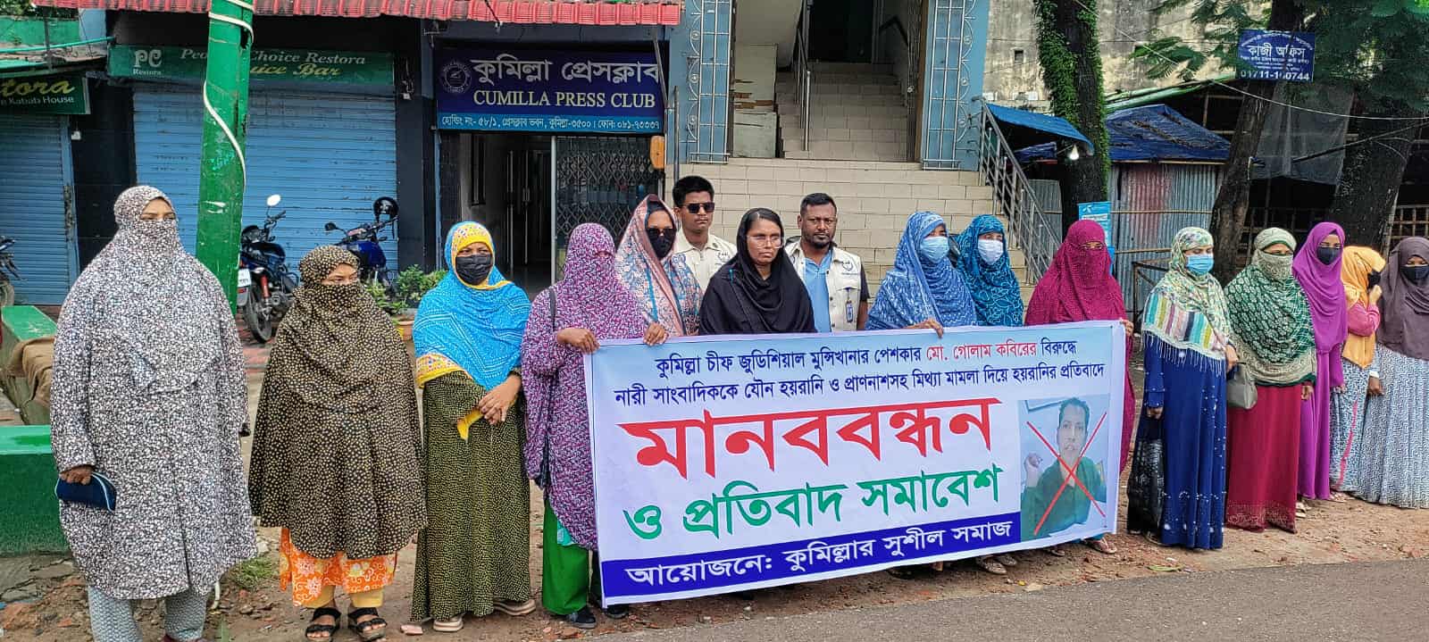 কুমিল্লা চীফ জুডিশিয়াল ম্যাজিস্ট্রেট আদালতের পেশকার মো. গোলাম কবিরের বিরুদ্ধে এক নারী সাংবাদিককে যৌন হয়রানি, প্রাণনাশের হুমকি ও ষড়যন্ত্রমূলক মামলা দায়েরের অভিযোগ উঠেছে। বুধবার (১৩ আগস্ট) সকালে কুমিল্লা প্রেসক্লাবের সামনে নারী সাংবাদিক মোসা. সালমা আক্তারের ওপর এ সকল নির্যাতনের প্রতিবাদে মানববন্ধন ও প্রতিবাদ সমাবেশ অনুষ্ঠিত হয়। মানববন্ধনে নারী সমাজ, সাংবাদিক, মানবাধিকারকর্মী ও সুশীল সমাজের প্রতিনিধিরা অংশগ্রহণ করেন। মানববন্ধনে ভুক্তভোগী সাংবাদিক মোসা. সালমা আক্তার জানান, তিনি দীর্ঘদিন ধরে ‘দৈনিক ভোরের সময়’ পত্রিকার কোর্ট প্রতিনিধি হিসেবে কাজ করছেন। আদালতের বিজ্ঞাপন বিভাগ থেকে পলাতক আসামিদের বিজ্ঞপ্তি সংগ্রহের সূত্রে পেশকার গোলাম কবিরের সঙ্গে তার পরিচয় হয়। সালমার অভিযোগ, এক পর্যায়ে পেশকার কবির তাকে চা খাওয়ার কথা বলে গাড়িতে তুলে নিয়ে চলন্ত অটোরিকশার ভেতরে অশালীনভাবে স্পর্শ করেন। এ সময় তিনি প্রতিবাদ করে চিৎকার শুরু করলে চালক গাড়ি থামিয়ে দেয় এবং তিনি দ্রুত নেমে যান। তিনি জানান, ঘটনার পর থেকে পেশকার কবির তাকে ফোন ও একেক বার একেক হোয়াটস অ্যাপ থেকে বিভিন্ন ভাবে বারবার হুমকি দেন। শারীরিক সম্পর্কে রাজি না হলে সালমার পত্রিকায় আর কোনো বিজ্ঞাপন দেওয়া হবে না বলেও জানানো হয়। এছাড়া তাকে “শেষ করে দেওয়া হবে” এমন ভয়ভীতি ও দেখানো হয়, যাতে কোনো প্রমাণ না থাকে। অজ্ঞাত পরিচয়ের সন্ত্রাসীরাও একাধিকবার তার বাসায় গিয়ে ভয় দেখিয়েছে বলেও অভিযোগ করেন সালমা আক্তার। সালমার ভাষ্য অনুযায়ী, শুধু হুমকি দিয়েই থেমে থাকেননি পেশকার কবির। তিনি নানাভাবে সালমার নামে অপপ্রচার চালাচ্ছেন এবং তার ব্যক্তিগত শত্রুদের সঙ্গে হাত মিলিয়ে তাকে ফাঁসাতে চেষ্টা করছেন। এরই ধারাবাহিকতায় গত ১০ আগস্টে ২৫ অজ্ঞাত এক ব্যক্তিকে বাদী করে সালমার নামে তিতাস থানায় তার বিরুদ্ধে একটি মিথ্যা চাঁদাবাজির মামলাও দায়ের করা হয়েছে। তিনি আরও বলেন, গোলাম কবির নিজেকে জুডিশিয়াল পেশকার হিসেবে প্রভাব খাটিয়ে আমার ওপর অন্যায়ভাবে নির্যাতন চালাচ্ছেন। তিনি বলেন, জুডিশিয়াল ম্যাজিস্ট্রেটরাও নাকি কবিরের কথায় চলে। সালমা জানায় আমি মানসিকভাবে ভেঙে পড়েছি। সাংবাদিক সালমা আক্তার এ বিষয়ে কুমিল্লা চীফ জুডিশিয়াল ম্যাজিস্ট্রেট বরাবর লিখিত অভিযোগ দিয়েছেন এবং যৌন হয়রানি ও ষড়যন্ত্রমূলক মামলার প্রতিকার চেয়ে দৃষ্টান্তমূলক শাস্তির দাবি জানিয়েছেন। সাংবাদিক সালমা আরো জানান জুডিশিয়াল পেশকার কবির এর জন্য সালমা কোন বাড়া বাসায় গিয়ে থাকতে পারে না, যেখানেই বাসা নেওয়া হয় সেখানে গিয়ে পেশকার কবির বাসা খুজে খুজে বের করে, সাংবাদিক সালমাকে যৌন হয়রানী করা হয়, পেশ