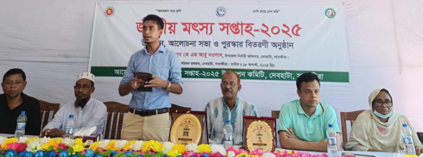 সাতক্ষীরার দেবহাটায় জাতীয় মৎস্য সপ্তাহ ২০২৫, উৎযাপন উপলক্ষ্যে র্যালী,আলোচনা ও শ্রেষ্ঠ মৎস্য চাষীদের পুরস্কার বিতরণী অনুষ্ঠান অনুষ্ঠিত হয়েছে। ১৮ ই আগষ্ট সোমবার সকাল ১০ টায় উপজেলা মসজিদ কমপ্লেক্স ভবনের নিচ তলায় আলোচনা সভা ও পুরস্কার বিতরণী অনুষ্ঠান হয়। তার আগে সকাল ৯.৩০ টায় দেবহাটা উপজেলা মৎস্য অধিদপ্তরের আয়োজনে বর্ণাঢ্য র্যালীটি উপজেলার প্রধান প্রধান সড়ক প্রদক্ষিণ করে মসজিদ চত্বরে এসে শেষ হয় এবং উপজেলা পুকুরে কাপ জাতীয় মাছ রুই, কাতল ও মৃগেল মাছ অপমুক্ত করা হয়। পরে আলোচনা সভা ও শ্রেষ্ঠ মৎস্য চাষীদের পুরস্কার বিতরণী অনুষ্ঠানে, দেবহাটা উপজেলা নির্বাহী কর্মকর্তা কে এম আবু নওশাদ এর সভাপতিত্বে ও উপজেলা একাডেমি সুপার ভাইজার মিজানুর রহমান এর সঞ্চালনায় অনুষ্ঠানে বক্তব্য রাখেন দেবহাটা উপজেলা বিএনপির সাবেক আহবায়ক ও জেলা বিএনপির সদস্য সিরাজুল ইসলাম, উপজেলা জামায়াতের আমীর মাওলানা অলিউল ইসলাম, উপজেলা সিনিয়ার মৎস্য কর্মকর্তা আবুবক্কর সিদ্দিক, বিএনপি নেতা ও পারুলিয়া ইউনিয়নের চেয়ারম্যান গোলাম ফারুক বাবু, নওয়াপাড়া ইউনিয়নের ভারপ্রাপ্ত চেয়ারম্যান মোনায়েম হোসেন ও সফল মৎস্য চাষী জাহাঙ্গীর আলম। এসময় দেবহাটা রিপোর্টার্স ক্লাবের সভাপতি ডাঃ অহিদুজ্জামান, সাধারন সম্পাদক রফিকুল ইসলাম ও সাংগঠনিক সম্পাদক আবদুল্লাহ আল মামুন, উপজেলা সমবায় কর্মকর্তা মনোজিত কুমার, মহিলা বিষয়ক কর্মকর্তা নাসরিন জাহান, উপজেলা খাদ্য কর্মকর্তা শাহীনা খাতুন, উপজেলা জনস্বাস্থ্য কর্মকর্তা সঞ্জয় কুমার মন্ডল সহ উপজেলার সফল বিভিন্ন মৎস্যচাষীরা উপস্থিত ছিলেন। অনুষ্ঠান শেষে সফল কাবদা মৎস্য চাষী গোলাম ফারুক সরদার, সফল কার্প মৎস্য চাষী রিয়াজুল ইসলাম, সফল চাষী আমিরুল ইসলাম ও মিজানুর রহমান সহ কয়েক জন মৎস্য চাষীদের সফল ক্রেস্ট ও সনদ প্রদান করা হয়।