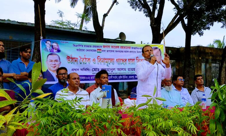 রাজশাহীর মোহনপুরে গাছের চারা বিতরণ করেন রাজশাহী জেলা বিএনপির সাবেক যুগ্ম সম্পাদক ও ছাত্রদল রাজশাহী জেলার সাবেক সভাপতি এমপি পদপ্রার্থী রায়হানুল আলম রায়হান। শনিবার (৩০ আগস্ট) বিকালে উপজেলার বাঘবাজারে বিএনপির ভারপ্রাপ্ত চেয়ারম্যান তারেক রহমানের উপস্থাপিত রাষ্ট্র কাঠামো মেরামতের ৩১ দফা রূপরেখা জনগণের মাঝে প্রচারের উদ্দেশ্যে লিফলেট বিতরণ ও উঠান বৈঠক শেষে ফলজ ও ঔষধি গাছের চারা বিতরণ করেন তিনি। তিনি বলেন, বিএনপি যা বলে তা করে দেখায়। বিগত দিনে বিএনপি যা বলেছিলো, তা ১৯৯১ সালে জনগণের ভোটে নির্বাচিত হয়ে জনগণের কল্যাণের জন্য কাজ করে দেখিয়েছেন। আগামীতে বিএনপি সরকার ক্ষমতায় আসলে জনগণের জন্য ৩১ দফা বাস্তবায়ন করা হবে। যার ফলে জনগণ দেশে স্বাধীন ভাবে বাঁচতে পারবেন।তিনি আরো বলেন, সাংবাদিকরা স্বাধীন ভাবে সংবাদ প্রকাশ করতে পারে না। বিএনপির ৩১ দফার মধ্যে উল্লেখ্য আছে, সাংবাদিকতা কিভাবে স্বাধীন পেশায় রুপান্তরিত করতে হবে। সেসময় সাংবাদিক নির্ভয়ে সকল অপরাধের বিরুদ্ধে লিখতে পারবে ও প্রকাশ করতে পারবেন। এসময় উপস্থিত ছিলেন, মোহনপুর উপজেলা বিএনপির সাবেক সাধারণ সম্পাদক অধ্যক্ষ গিয়াস উদ্দিন, উপজেলা যুবদলের সাবেক যুগ্ম আহ্বায়ক আহসান হাবীব, নয়ন শাহ্, রাজশাহী জেলা স্বেচ্ছাসেবক দলের সদস্য আলম সরদার, জেলা কৃষক দলের সদস্য মুকুল শাহ, ধুরইল ৪ নং ওয়ার্ড বিএনপির সভাপতি আব্দুস সালাম, জাহানাবাদ ইউনিয়ন বিএনপির সাবেক সাংগঠনিক সম্পাদক আব্দুল হান্নান, ঘাসিগ্রাম ইউপির সাবেক মেম্বার জনাব আলী, উপজেলা ছাত্রদলের যুগ্ম আহ্বায়ক মাইনুল ইসলাম হিরো, বাংলাদেশ জাতীয়বাদী প্রজন্ম ৭১ দলের উপজেলা শাখার যুগ্ম আহ্বায়ক রাসেলসহ বিএনপির অঙ্গ সংগঠনের নেতাকর্মীরা।