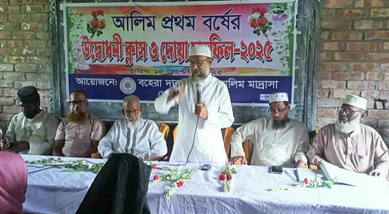সাতক্ষীরার দেবহাটা উপজেলার কুলিয়ার বহেরা দারুল উলুম আলিম মাদ্রাসায় প্রথম বর্ষের উদ্ধোধনী ক্লাস উপলক্ষে দোয়া মাহফিল ও আলোচনা সভা অনুষ্ঠিত হয়েছে। সোমবার সকাল ১০ ঘটিকায় বহেরা দারুল উলুম আলিম মাদ্রাসায় দোয়া মাহফিল ও আলোচনা সভা অনুষ্ঠিত হয়। অত্র মাদ্রাসার অধ্যক্ষ মাওলানা ওয়ালিদ হোসাইন এর সভাপতিত্বে প্রধান অতিথি হিসেবে উপস্থিত ছিলেন সাতক্ষীরা জেলা জামায়াতের সহকারী সেক্রেটারি মাহবুবুল আলম। বিশেষ অতিথি হিসেবে বক্তব্য রাখেন দেবহাটা উপজেলা জামায়াতের আমির মাওলানা অলিউল ইসলাম। বক্তব্য রাখেন অত্র মাদ্রাসার প্রতিষ্ঠাতা সভাপতি মাওলানা আব্দুস সাত্তার ও সাবেক সভাপতি নুরুল মোমিন।এ সময় শিক্ষক ইদ্রিস আলী, মাওলানা খাইরুল ইসলাম, মোস্তাফিজুর রহমান, মিজানুর রহমান, কবিরুল ইসলাম, সাংবাদিক রুহুল আমিন, গ্রাম ডা: হাফিজুল ইসলাম, শোকর আলী সহ ছাত্র-ছাত্রীরা উপস্থিত ছিলেন। সমগ্র অনুষ্ঠানটি পরিচালনা করেন হাফেজ মাওলানা আব্দুস সাত্তার।