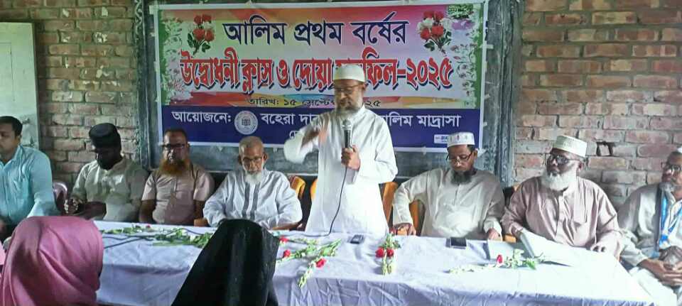 সাতক্ষীরার দেবহাটা উপজেলার কুলিয়ার বহেরা দারুল উলুম আলিম মাদ্রাসায় প্রথম বর্ষের উদ্ধোধনী ক্লাস উপলক্ষে দোয়া মাহফিল ও আলোচনা সভা অনুষ্ঠিত হয়েছে। সোমবার সকাল ১০ ঘটিকায় বহেরা দারুল উলুম আলিম মাদ্রাসায় দোয়া মাহফিল ও আলোচনা সভা অনুষ্ঠিত হয়। অত্র মাদ্রাসার অধ্যক্ষ মাওলানা ওয়ালিদ হোসাইন এর সভাপতিত্বে প্রধান অতিথি হিসেবে উপস্থিত ছিলেন সাতক্ষীরা জেলা জামায়াতের সহকারী সেক্রেটারি মাহবুবুল আলম। বিশেষ অতিথি হিসেবে বক্তব্য রাখেন দেবহাটা উপজেলা জামায়াতের আমির মাওলানা অলিউল ইসলাম। বক্তব্য রাখেন অত্র মাদ্রাসার প্রতিষ্ঠাতা সভাপতি মাওলানা আব্দুস সাত্তার ও সাবেক সভাপতি নুরুল মোমিন।এ সময় শিক্ষক ইদ্রিস আলী, মাওলানা খাইরুল ইসলাম, মোস্তাফিজুর রহমান, মিজানুর রহমান, কবিরুল ইসলাম, সাংবাদিক রুহুল আমিন, গ্রাম ডা: হাফিজুল ইসলাম, শোকর আলী সহ ছাত্র-ছাত্রীরা উপস্থিত ছিলেন। সমগ্র অনুষ্ঠানটি পরিচালনা করেন হাফেজ মাওলানা আব্দুস সাত্তার।