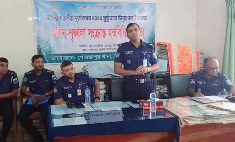চাঁপাইনবাবগঞ্জের গোমস্তাপুরে আসন্ন শারদীয় দূর্গোৎসব ২০২৫ উদযাপন উপলক্ষে গোমস্তাপুরে আইন-শৃঙ্খলা সংক্রান্ত মতবিনিময় সভা অনুষ্ঠিত হয়েছে।রবিবার (২১ সেপ্টেম্বর) বেলা ১১ টায় গোমস্তাপুর থানা পুলিশের আয়োজনে রহনপুর পুলিশ তদন্ত কেন্দ্রে এই মতবিনিময় সভায় সভাপতিত্ব করেন গোমস্তাপুর থানার অফিসার ইনচার্জ, ওয়াদূদ আলম,এতে প্রধান অতিথি হিসেবে উপস্থিত ছিলেন,অতিরিক্ত পুলিশ সুপার গোমস্তাপুর সার্কেল হাসান তারেক,বিশেষ অতিথি হিসেবে উপস্থিত ছিলেন, রহনপুর পুলিশ তদন্ত কেন্দ্রের অফিসার ইনচার্জ, ফরিদউজ্জামান,বাংলাদেশ পুজা উদযাপন পরিষদ গোমস্তাপুর উপজেলার সভাপতি শচীন দেব বর্মন, সাধারণ সম্পাদক সুমন সাহা, গোমস্তাপুর উপজেলা প্রেসক্লাব সভাপতি নূর মোহাম্মদ, গোমস্তাপুর স্মার্ট প্রেস ক্লাবের সভাপতি ডা: আব্দুল ওয়াদুদ, সাধারণ সম্পাদক সামিরুল ইসলাম, সাংবাদিক আলাউদ্দিন পারভেজ,আমিনুল ইসলাম, বাবুল হক,