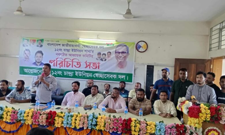চাঁদপুর সদর উপজেলার চান্দ্রা ইউনিয়ন স্বেচ্ছাসেবক দলের আহ্বায়ক কমিটির পরিচিতি সভা অনুষ্ঠিত হয়েছে।২৩শে’ সেপ্টেম্বর মঙ্গলবার বিকাল ৩ টায় চান্দ্রা বাজার নূরীয়া ফাযিল (ডিগ্রি), মাদ্রাসার হল রুমে পরিচিতি সভায় প্রধান অতিথি’ বক্তব্য রাখেন সদর উপজেলা স্বেচ্ছাসেবক দলের আহ্বায়ক মোঃ আবু হানিফ কাকন।১২ নং চান্দ্রা ইউনিয়ন স্বেচ্ছাসেবক দলের আহ্বায়ক মোহাম্মদ আলী মল্লিকের সভাপতিত্বে ও সদস্য সচিব মোঃ কাকন মিজির সঞ্চলনায় বিশেষ অতিথি’র বক্তব্য রাখেন সদর থানা স্বেচ্ছাসেবক দলের সদস্য সচিব পীরজাদা জুনায়েদ উল্লাহ খান, ইউনিয়ন বিএনপির সভাপতি মোফাজ্জল হোসেন মফু,সিনিয়র সহ সভাপতি মোঃ মোর্শেদ আলম মাষ্টার, সিনিয়র যুগ্ম সাধারণ সম্পাদক মোঃ গিয়াস উদ্দিন মিন্টু মাঝি,সদর থানা স্বেচ্ছাসেবক দলের সিনিয়র যুগ্ন আহ্বায়ক আঃ হান্নান মিজি,মোঃ আবুল হোসেন গাজী, মোঃ সোহেল হোসেন মৃধা,আঃ আউয়াল, মোহাম্মদ হোসেন নয়ন,আবু সুফিয়ান,জাহিদুল ইসলাম নোমান, ইউনিয়ন যুবদলের সভাপতি খোরশেদ গাজী, সাধারণ সম্পাদক দেলোয়ার হোসেন গাজী, সিনিয়র সহসভাপতি আমজাদ, ইউনিয়ন স্বেচ্ছাসেবক দলের সাবেক সভাপতি মোঃ মাসুদ মিজি, স্বেচ্ছাসেবক নেতা শাহ আলম হাওলাদার, ইউনিয়ন ছাত্রদলের সাধারন সম্পাদক মোঃ আজাদ বেপারী,