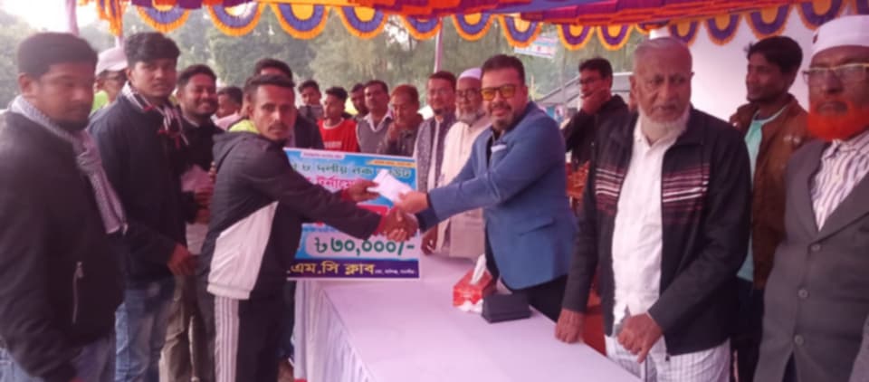 শেখ ফারুক হোসেন বিশেষ প্রতিনিধিঃ সাতক্ষীরার কালিগঞ্জে আটদলীয় লক্ষ টাকার নকআউট ফুটবল টুর্নামেন্টের ফাইনাল খেলায় ঈশ্বরীপুরে স্পোর্টিং ক্লাব চাম্পিয়ান হয়েছে।রানার্স আপের গৌরবদ অর্জন করে নলতা শরীফ ফুটবল একাডেমি। কালিগঞ্জ উপজেলার মথুরেসপুরোঠে দিয়া মাঝের মাঠ ডিএমসি ক্লাবের আয়োজনে লক্ষ টাকার নক আউট ফুটবল টুর্নামেন্টের ফাইনাল খেলায় একদিকে অংশগ্রহণ করে নলতা শরীফ ফুটবল একাডেমি বনাম ইশ্বরীপুর স্পোর্টিং ক্লাব ফুটবল একাদশ। ১৫ই ডিসেম্বর বিকাল ৪ঃ০০ টায় ডিএমসি ক্লাবের মাঝের মাঠে শীতের পড়ন্ত বিকালে হাজার হাজার ফুটবল ক্রীড়া মোদী দর্শকের উপস্থিতিতে মথুরেশপুর ইউনিয়নের চেয়ারম্যান বীর মুক্তিযোদ্ধা আব্দুল হাকিমের সভাপতিত্বে অনুষ্ঠিত ফাইনাল খেলায় প্রধান অতিথি হিসেবে উপস্থিত ছিলেন বিলটেক গ্রুপের চেয়ারম্যান এসএম এমদাদ হোসেন। বিশেষ অতিথি হিসেবে উপস্থিত ছিলেন ডা. আকসেদুর রহমান, ডা. আরাফাত আহমেদ, আব্দুল হাই, আবু হাসান রাজ, সাংবাদিক শেখ শরিফুল ইসলাম, মোঃ শের আলী,মোহাম্মদ জাকির হোসেন রাজু, মোদাচ্ছের রহমান,নূর মোহাম্মদ বাঢা মোল্লা, আবু হাসান, কলিম,ও হাফেজ খাইরুল বাশার,শেখ রিয়াজুল ইসলাম প্রমুখ। ডিএমসি ক্লাবের সভাপতি বাবলা আহমেমদ ও সাধারণ সম্পাদক নাসির উদ্দিন,সহ সেক্রেটারি মাসুম হাসানের সার্বিক ব্যবস্থাপনায় খেলাটির ধারা বর্ণনায় ছিল ইসমাইল হোসেন মিলন, এম আর মোস্তাক,সদস্য মোঃ আলমগীর হোসেন ও আবুল কালাম বিন আকবার সহ অন্যান্য অতিথিবৃন্দ। অতিথিরাব্ন্দ মাদক কে না বলি ক্রিয়াকে বুকে ধারণ করি এই স্লোগানকে সামনে রেখে খেলোয়াড়দের উৎসাহিত করেন এবং খেলাধুলার মাধ্যমে যুবসমাজকে মাদক ও অপরাধমুক্ত রাখতে এ ধরনের ক্রীড়া আয়োজনের গুরুত্ব তুলে ধরেন। প্রথম ও দ্বিতীয় অধ্যে হাড্ডাহাড্ডি লড়াইয়ে কোন গোল দেখা না মিলায় গোলশূন্য অবস্থায় খেলাটি ট্ব্রাইবেকারে গড়ায়। ঈশ্বরীপুর স্পোর্টিং ক্লাব ৩-১ গোলে নলতা শরীফ ফুটবল একাডেম একাদশ কে হারিয়ে চ্যাম্পিয়ন হওয়ার গৌরব অর্জনকরে। খেলায় ম্যান অফ দ্যা ম্যাচ নির্বাচিত হয় ঈশ্বরীপুর স্পোটিং ক্লাবের গোলরক্ষক জিকো।খেলায় ম্যান অব দ্যা সিরিজ পুরস্কার বিতরণ করেন আজমির ওয়ার্কশপের মালিক শেখ আব্দুর রব ছোটটু। খেলায় সেরা দর্শক, সেরা গোল দাতাকেও পুরস্কৃত করা হয়।খেলাটি রেফারির দায়িত্ব ছিলেন ফিফা রেফারি শেখ ইকবাল আলম বাবলু, শেখ মুশফিক এলাহি বাবু ও আতাউর রহমান আতা।খেলায় চ্যাম্পিয়ন দলকে ৫০ হাজারও রানার্স আপকে ৩০ হাজার সহ দেশি বিদেশি সেরা খেলোয়াড়দের মাঝে পুরস্কার বিতরণ করা হয়। ছবিঃ কালীগঞ্জের লক্ষ টাকার নক আউট ফুটবল টুর্নামেন্টের ফাইনালে চ্যাম্পিয়ন দলকে পুরস্কার বিতরণ করছেন অতিথিবৃন্দ।