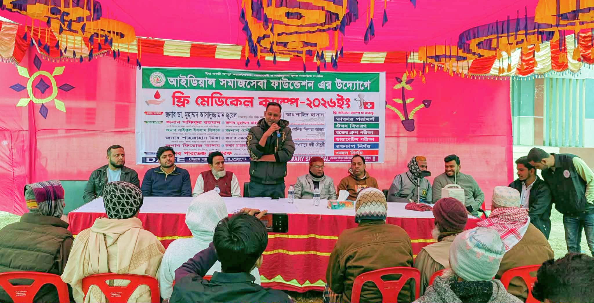 অরাজনৈতিক, স্বেচ্ছাসেবী ও সামাজিক সংগঠন আইডিয়াল সমাজসেবা ফাউন্ডেশন-এর উদ্যোগে চাঁদপুরের ফরিদগঞ্জে আয়োজন করা হয়েছে ফ্রি মেডিকেল ক্যাম্প–২০২৬। দিনব্যাপী এই কর্মসূচিতে বিভিন্ন বয়সের দুই শতাধিক রোগী বিনামূল্যে চিকিৎসা, স্বাস্থ্যপরামর্শ ও প্রয়োজনীয় ওষুধ গ্রহণ করেন। শনিবার (৩ জানুয়ারি) ফরিদগঞ্জ উপজেলার ৬নং গুপ্টি পশ্চিম ইউনিয়নের খাজুরিয়া বহুমুখী উচ্চ বিদ্যালয় ক্যাম্পাসে ক্যাম্পটি অনুষ্ঠিত হয়, যেখানে সকাল থেকে সন্ধ্যা পর্যন্ত স্বাস্থ্যসেবাগ্রহীতাদের উপচেপড়া ভিড় লক্ষ্য করা যায়।ক্যাম্প উদ্বোধন উপলক্ষে আয়োজিত অনুষ্ঠানে সভাপতিত্ব করেন সংগঠনের প্রতিষ্ঠাতা ও পরিচালক পারভেজ মোশারফ। প্রধান অতিথি হিসেবে উপস্থিত ছিলেন ফরিদগঞ্জ উপজেলা স্বাস্থ্য ও পরিবার পরিকল্পনা কর্মকর্তা ডা. মুহাম্মদ আসাদুজ্জামান জুয়েল। তিনি বলেন, “তরুণদের নেতৃত্বে পরিচালিত এ ধরনের সামাজিক উদ্যোগ গ্রামীণ জনগোষ্ঠীর স্বাস্থ্যসেবায় গুরুত্বপূর্ণ ভূমিকা রাখছে। সেবামুখী কর্মসূচি সমাজে ইতিবাচক পরিবর্তনের দৃষ্টান্ত স্থাপন করছে। অনুষ্ঠানে বিশেষ অতিথি হিসেবে উপস্থিত ছিলেন চাঁদপুর জেলা কর্মসংস্থান ও জনশক্তি অফিসের সহকারী পরিচালক ও খাজুরিয়া ইয়ুথ ক্লাবের সভাপতি সফিকুর রহমান, খাজুরিয়া ইয়ুথ ক্লাবের সাধারণ সম্পাদক ও চাঁদপুর জজকোর্টের আইনজীবী এমরান হোসেন, ফরিদগঞ্জ প্রেসক্লাবের নির্বাহী সদস্য ও সাবেক সাধারণ সম্পাদক প্রবীর চক্রবর্তী, খাজুরিয়া বহুমুখী উচ্চ বিদ্যালয়ের সহকারী প্রধান শিক্ষক শাহজাহান মিয়া, ৬নং গুপ্টি পশ্চিম ইউনিয়ন পরিবার পরিকল্পনা পরিদর্শক মেহেদী হাসান গাজী এবং পাটোয়ারী সার্জিক্যালের ব্যবস্থাপনা পরিচালক মাহাতাব উদ্দিন পাটোয়ারী। বক্তারা বলেন, একঝাঁক আদর্শবান তরুণের উদ্যোগ সমাজে মানবিক মূল্যবোধ জাগ্রত করছে এবং এই ধারা অব্যাহত থাকলে সাধারণ মানুষ আরও কাছাকাছি স্বাস্থ্যসেবা পাবে। দিনব্যাপী ক্যাম্পে চিকিৎসাসেবা প্রদান করেন—ডা. নাহিদ হাসান — মেডিসিন, হৃদরোগ, ডায়াবেটিস, হরমোন, মা ও শিশু রোগ, বাত ও চর্মরোগ বিশেষজ্ঞ ডা. রেদওয়ানুর নবী চৌধুরী — মেডিসিন, হৃদরোগ, অ্যাজমা, হাঁপানি, ডায়াবেটিস ও নিউরোমেডিসিন বিশেষজ্ঞ ডা. কানিজ দিলারা আজম — চর্ম, যৌন, অ্যালার্জি ও কসমেটিক রোগ বিশেষজ্ঞ ক্যাম্পে আগত রোগীদের জন্য রক্তের গ্রুপ নির্ণয়, ডায়াবেটিস পরীক্ষা, উচ্চ রক্তচাপ মাপা, ওজন পরিমাপ, সাধারণ স্বাস্থ্যপরামর্শ এবং বিনামূল্যে প্রয়োজনীয় ওষুধ বিতরণ করা হয়। পাশাপাশি রোগীদের স্বাস্থ্যসচেতনতা বাড়াতে বিভিন্ন বিষয়ে দিকনির্দেশনা দেওয়া হয়। সংগঠনের প্রতিষ্ঠাতা ও পরিচালক পারভেজ মোশারফ বলেন,“২০১৯ সাল থেকে সুবিধাবঞ্চিত, দরিদ্র ও নিম্