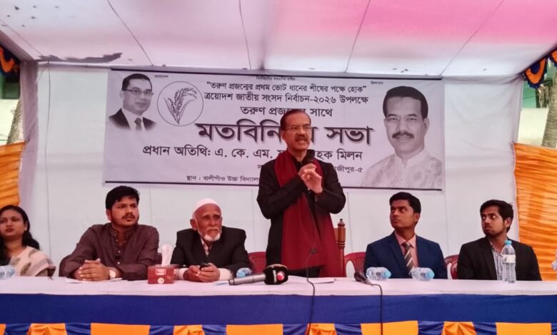 ত্রয়োদশ জাতীয় সংসদ নির্বাচনে গাজীপুর-৫ (কালীগঞ্জ, পুবাইল ও বাড়ীয়া) আসনে বিএনপি মনোনীত প্রার্থী একেএম ফজলুল হক মিলন আসনের তরুণ প্রজন্মের সাথে মতবিনিময় করেছেন। শুক্রবার (২৩ জানুয়ারী) বিকালে উপজেলার বালীগাঁও উচ্চ বিদ্যালয় মাঠে‘তরুন প্রজন্মের প্রথম ভোট, ধানের শীষের পক্ষে হউক’ স্লোগান সামনে রেখে মতবিনিময় সভায় প্রধান অতিথি হিসেবে উপস্থিত ছিলেন গাজীপুর জেলা বিএনপির আহ্বায়ক ও গাজীপুর-৫ আসনে বিএনপি মনোনীত সংসদ সদস্য পদপ্রার্থী সাবেক সংসদ সদস্য আলহাজ্ব একেএম ফজলুল হক মিলন। বিশেষ অতিথি উপজেলা বিএনপির আহ্বায়ক মোঃ হুমায়ুন কবির মাষ্টার। ঢাকা কলেজে সাবেক শিক্ষার্থী আবু বকর সিদ্দিক এর সঞ্চালনায় সভায় অন্যান্যের মাঝে বক্তব্য রাখেন, ঢাকা বিশ্ববিদ্যালয়ের সাবেক ছাত্র ও কালীগঞ্জ রাজা রাজেন্দ্র সরকারি উচ্চ বিদ্যালয়ের শিক্ষক কৃষাণ সাহা, জগন্নাথ বিশ্ববিদ্যালয়ের শিক্ষার্থী তানজিলা আক্তার, কালীগঞ্জ বিডি ক্লিন সমন্বয়ক আশিক রহমান (সৈকত), কালীগঞ্জ মহিলা উদ্যোক্তা ফারজানা আক্তার পলি, ঢাকা বিভাগের এফ ফিল গবেষক মুফতী আব্দুল্লাহ আল মামুন, গ্রামীণ ফোন এক্রিকিউটিভ অফিসার সোহান মোল্লা, কালীগঞ্জ বাজারের তরুণ ব্যবসায়ী সাব্বীর আহমেদ, কালীগঞ্জ সেন্ট্রাল কলেজের প্রভাষক নুশরাত জাহান (মুনা), রাজশাহী বিশ্ববিদ্যালয়ের শিক্ষার্থী মোঃ নাজমুল ইসলাম, ঢাকা বিশ্ববিদ্যালয়ের মাইক্রো বায়োলজির শিক্ষার্থী রিহান, জুলাই যোদ্ধা রানা সরকার, ইডেন মহিলা কলেজের শিক্ষার্থী মাহফুজা বিন সুস্মিতা প্রমূখ। প্রধান অতিথি বিএনপি মনোনীত ধানের শীষ প্রতীকের প্রার্থী একেএম ফজলুল হক মিলন বলেন, অতীতে আমার এবং আমার পরিবারের উপর হামলা মামলা সহ সব কিছুই আমি সাধারণ ক্ষমা করে দিয়েছি। কারণ ক্ষমা মহত্নের লক্ষণ। আমি নির্বাচিত হলে কালীগঞ্জে সবাই মুক্তভাবে বিচরণ করতে পারবে। কালীগঞ্জের শান্তি, পরিবেশের উন্নতি, চিকিৎসা সেবা ও শিক্ষার মান উন্নয়ন কল্পে কাজ করে কালীগঞ্জকে একটি আধুনিক কালীগঞ্জ হিসেবে তৈরী করব। আমি কালীগঞ্জকে একটি গোলাপ ফুলের বাগান তৈরি করতে চাই। আগামী ১২ তারিখ ধানের শীষ প্রতীকে ভোট দিয়ে স্বাধীনতার পক্ষে সুন্দর বাংলাদেশ এবং সুন্দর কালীগঞ্জ তৈরি করার লক্ষে আমাকে কাজ করার সুযোগ দিন। এ সময় অন্যান্যের মাঝে কালীগঞ্জ পৌর বিএনপির আহ্বায়ক কমিটির সদস্য মোঃ লুৎফর রহমান, মোন্তাজ উদ্দিন মাষ্টার, সালাহ উদ্দিন আহমেদ, মনির উদ্দিন পাঠান (মিঠু), গাজীপুর জেলা স্বেচ্ছাসেবক দলের আহবায়ক আশরাফ নেওয়াজ চৌধুরী (শাওন), উপজেলা যুবদলের আহবায়ক আলী নুর হাসান, সদস্য সচিব হাসানুর রহমান (জুয়েল), উপজেলা স্বেচ্ছাসেবক দলের আহবায়ক সাইফুল ইসলাম (সুমন), সদস্য সচিব জুবায়ের আহমেদ, ডাক্তার হোসন
