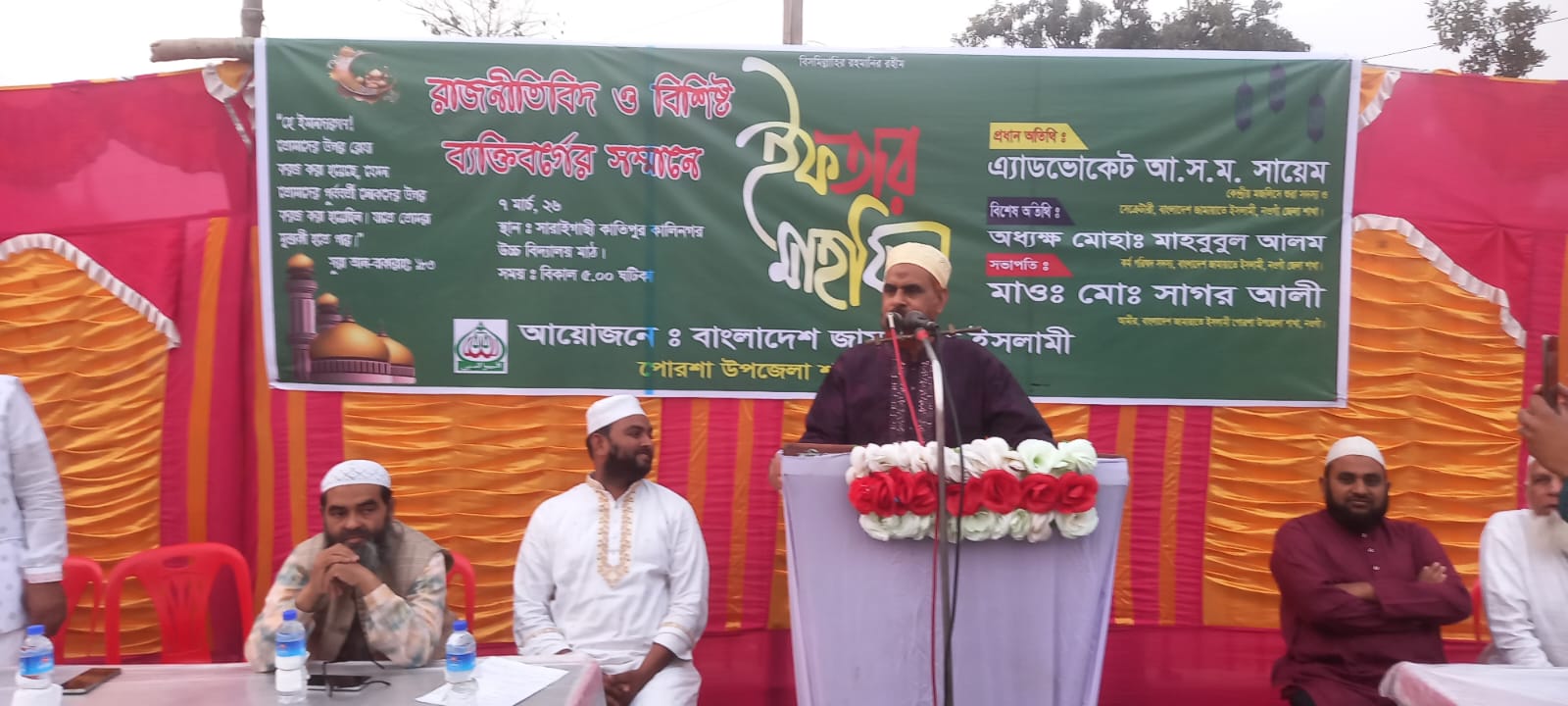নওগাঁর পোরশায় উপজেলা জামাতের আয়োজনে কাতিপুর কালিনগর স্কুল মাঠে পোরশা উপজেলা জামাতের আয়োজনে এক ইফতার মাহফিল ও আলোচনা সভা অনুষ্ঠিত হয়। এতে সভাপতিত্ব করেন উপজেলা জামাতের আমির মোঃ সাগর আলী। উক্ত ইফতার ও দোয়া মাহফিলে প্রধান অতিথি হিসেবে উপস্থিত ছিলেন এ্যাডভোকেট আবু সাদাত মোঃ সায়েম, সেক্রেটারী, নওগাঁ জেলা জামায়াতে ইসলাম। বিশেষ অতিথি হিসেবে উপস্থিত ছিলেন জনাব মোহাঃ মাহবুবুল আলম, কর্মপরিষদের সদস্য, নওগাঁ জেলা জামায়াতে ইসলাম, এবং বিশষ অতিথি হিসেবে উপস্থিত ছিলেন সহকারী অধ্যাপক ও নওগাঁ জেলা জামাতের সেক্রেটারি এবং নওগাঁজেলার শ্রমিক ফেডারেশনের সভাপতি মোঃ নাসির উদ্দিন, বিশেষ অতিথি হিসেবে উপস্থিত ছিলেন মোঃ আব্দুল হক শাহ চৌধুরী, সাবেক সভাপতি, ইসলামী আন্দোলন পোরশা উপজেলা। এছাড়াও উপস্থিত ছিলেন মোঃ শরিফুল ইসলাম (সাধারণ সম্পাদক ,পোরশা উপজেলা জামায়াতে ইসলাম, মোঃ ইয়াদুল হক