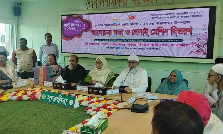 আজকের পদক্ষেপ, আগামীর ন্যায়বিচার—সুরক্ষিত হোক নারী ও কন্যার অধিকার” প্রতিপাদ্যকে সামনে রেখে আন্তর্জাতিক নারী দিবস–২০২৬ উদযাপন উপলক্ষে সাতক্ষীরায় আলোচনা সভা ও সেলাই মেশিন বিতরণ অনুষ্ঠিত হয়েছে। রবিবার (৮ মার্চ) সকালে সাতক্ষীরা জেলা প্রশাসকের কার্যালয়ে জেলা প্রশাসন ও মহিলা বিষয়ক অধিদপ্তরের আয়োজনে এ কর্মসূচি অনুষ্ঠিত হয়।জেলা প্রশাসক মিজ্ আফরোজা আখতার-এঁর সভাপতিত্বে অনুষ্ঠানে প্রধান অতিথি হিসেবে বক্তব্য রাখেন সাতক্ষীরা–২ আসনের মাননীয় সংসদ সদস্য মুহাদ্দিস আব্দুল খালেক। এসময় বিশেষ অতিথি হিসেবে উপস্থিত ছিলেন সাতক্ষীরা–৩ আসনের মাননীয় সংসদ সদস্য মুহাদ্দিস রবিউল বাশার, অতিরিক্ত জেলা প্রশাসক (সার্বিক) বিষ্ণুপদ পাল, জেলা জামায়াতের আমীর শহিদুল ইসলাম মুকুল, কৃষি সম্প্রসারণ অধিদপ্তরের উপ-পরিচালক মোঃ সাইফুল ইসলাম, সমাজসেবা অধিদপ্তরের উপ-পরিচালক সাইদুর রহমান মৃধাসহ বিভিন্ন সরকারি দপ্তরের প্রতিনিধি ও সংগঠনের নেতৃবৃন্দ। সভায় বক্তারা বলেন, নারীর প্রতি সহিংসতা রোধ, নারী-পুরুষের সমঅধিকার নিশ্চিত করা এবং নারীর কাজের স্বীকৃতি প্রদানের পাশাপাশি তাদের অর্থনৈতিক, রাজনৈতিক ও সামাজিক সাফল্য উদ্যাপনের লক্ষ্যেই বিশ্বব্যাপী নানা আয়োজনে আন্তর্জাতিক নারী দিবস পালন করা হচ্ছে। বক্তারা আরও বলেন, নারীদের আরও এগিয়ে নিতে তাদের প্রতি হিংসা-বিদ্বেষ কমিয়ে অধিকার নিশ্চিত করতে হবে। সমৃদ্ধ বাংলাদেশ গড়তে নারী-পুরুষ সবাইকে সম্মিলিতভাবে কাজ করতে হবে। অনুষ্ঠান শেষে সুবিধাবঞ্চিত নারীদের মাঝে সেলাই মেশিন বিতরণ করা হয়। সমগ্র অনুষ্ঠানটি সঞ্চালনা করেন মহিলা বিষয়ক অধিদপ্তরের জেলা উপ-পরিচালক নাজমুন নাহার।