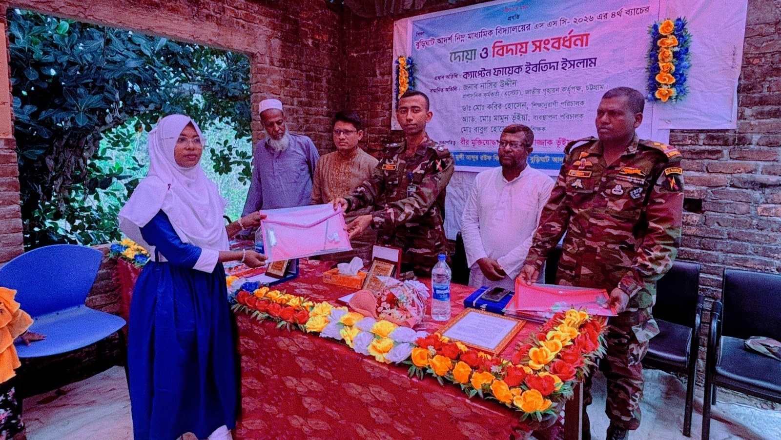 রাঙ্গামাটি জেলার নানিয়ারচর উপজেলায় মানবিক ও শিক্ষাবান্ধব উদ্যোগের অংশ হিসেবে শিক্ষার্থীদের জন্য আয়োজন করা হয়েছে এক আন্তরিক বিদায়ী সংবর্ধনা। সম্প্রীতি ও উন্নয়ন প্রকল্পের আওতায় নানিয়ারচর সেনা জোনের ব্যবস্থাপনায় বুড়িঘাট আদর্শ নিম্ন মাধ্যমিক বিদ্যালয়ের এসএসসি পরীক্ষার্থীদের সম্মানে এ আয়োজন অনুষ্ঠিত হয়।শনিবার (এপ্রিল ২০২৬) বুড়িঘাট ইউনিয়নের বিদ্যালয় প্রাঙ্গণে আয়োজিত অনুষ্ঠানে প্রধান অতিথি হিসেবে উপস্থিত ছিলেন বুড়িঘাট আর্মি ক্যাম্পের ক্যাম্প কমান্ডার লেফটেন্যান্ট মোঃ সামিউল ইসলাম সিয়াম। এ সময় তিনি শিক্ষার্থীদের উদ্দেশ্যে গুরুত্বপূর্ণ দিকনির্দেশনামূলক বক্তব্য প্রদান করেন।প্রধান অতিথি তাঁর বক্তব্যে বলেন, শুধুমাত্র ভালো ফলাফলই নয়, বরং নৈতিকতা, শৃঙ্খলা ও মানবিক মূল্যবোধ অর্জনই একজন শিক্ষার্থীকে প্রকৃত মানুষ হিসেবে গড়ে তোলে। তিনি শিক্ষার্থীদের মনোযোগ সহকারে পড়াশোনা করার পাশাপাশি দেশের কল্যাণে নিজেদের প্রস্তুত করার আহ্বান জানান।অনুষ্ঠানের একপর্যায়ে নানিয়ারচর সেনা জোনের পক্ষ থেকে পরীক্ষার্থীদের মাঝে বিভিন্ন পরীক্ষা সহায়ক শিক্ষা সামগ্রী বিতরণ করা হয়। এতে শিক্ষার্থীদের মাঝে উৎসাহ-উদ্দীপনা লক্ষ্য করা যায় এবং তারা সেনাবাহিনীর এমন উদ্যোগের জন্য কৃতজ্ঞতা প্রকাশ করে।উল্লেখ্য, বাংলাদেশ সেনাবাহিনী দেশের প্রত্যন্ত অঞ্চলে শিক্ষা, সামাজিক উন্নয়ন ও মানবিক সহায়তায় গুরুত্বপূর্ণ ভূমিকা পালন করে আসছে। নানিয়ারচর সেনা জোনের এ ধরনের উদ্যোগ স্থানীয় শিক্ষার্থীদের মাঝে ইতিবাচক প্রভাব ফেলবে বলে সংশ্লিষ্টরা মনে করছেন।