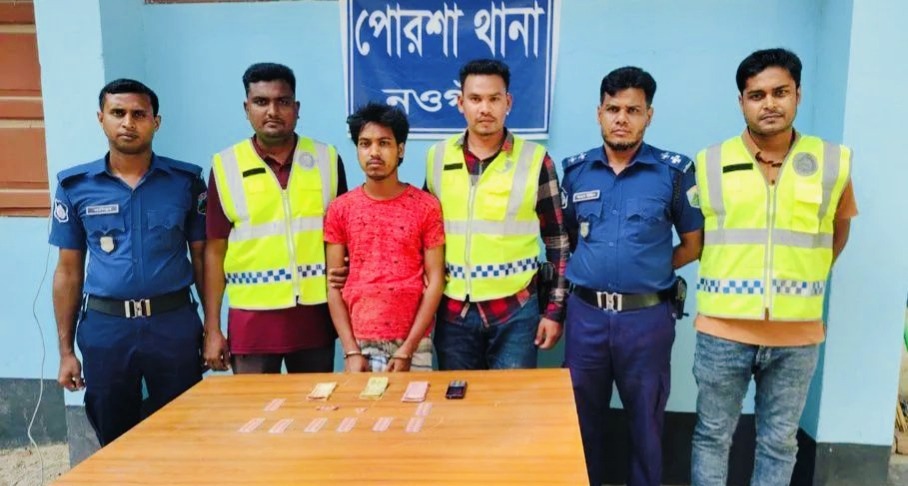নওগাঁর পোরশায় পুলিশ সুপার মোহাম্মদ তারিকুল ইসলামেরদ দিক নির্দেশনায় ও অফিসার ইনচার্জ মোঃ জিয়াউর রহমান, পোরশা থানা, নওগাঁ এর নেতৃত্বে অদ্য ইং ১৯/০৪/২০২৬ তারিখ দুপুর অনুমান ১৪.১০ ঘটিকায় পোরশা থানাধীন ইটাপুকুর গ্রাম গামী জনৈক আঃ রকিব এর নির্মানাধীন বাড়ির পূর্ব পার্শ্বে তিন রাস্তার মোড়ের উপর সঙ্গীয় অফিসার ও ফোর্সসহ গোপন সংবাদের ভিত্তিতে মাদক বিক্রয়কালে একজন মাদক ব্যবসায়িকে আটক করা হয়। উক্ত মাদক ব্যবসায়ি মোঃ শামীম (২৯), পিতা-মোঃ আতাউর রহমান মিয়াজি, মাতা-মোছাঃ ছায়েরা খাতুন, সাং-পোরশা, থানা-পোরশা, জেলা-নওগাঁ এর দেহ তল্লাশি করিয়া তাহার পরিহিত লুঙ্গীর ডান কোচর হইতে সর্বমোট ৮৬ পিস ট্যাপেন্টাডল ট্যাবলেট, যাহার অনুমান মূল্য ২৫,৮০০/-(পঁচিশ হাজার আটশত) টাকা ও মাদক বিক্রয়ের ৫৫০/-উদ্ধার পূর্বক জব্দ করা হয়। ধৃত মাদক ব্যবসায়ির বিরুদ্ধে আইনগত ব্যবস্থা প্রক্রিয়াধীন। মাদক বিরোধী অভিযান চলমান আছে।