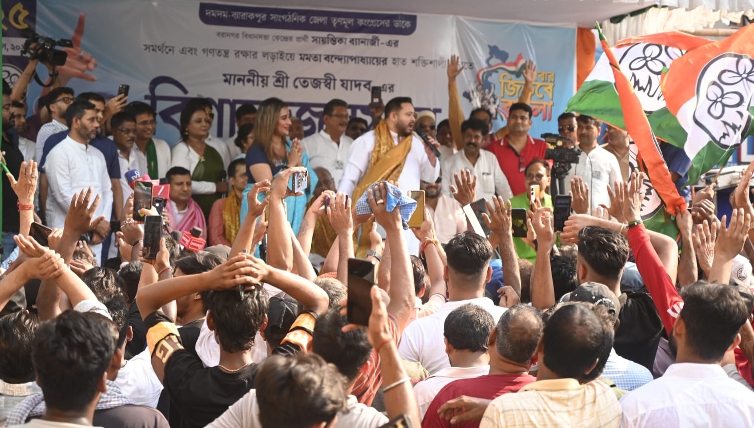 আসন্ন বিধানসভা নির্বাচনকে সামনে রেখে ১১৩ নম্বর বরানগর বিধানসভা কেন্দ্রে তৃণমূল কংগ্রেস প্রার্থী সায়ন্তিকা ব্যানার্জীর সমর্থনে অনুষ্ঠিত হলো বিশাল পথসভা ও প্রচার মিছিল। শনিবার (২৫ এপ্রিল) দুপুরে আলমবাজার মোড় থেকে শুরু হওয়া এই পথসভায় বিশেষ অতিথি হিসেবে উপস্থিত ছিলেন তেজস্বী যাদব।অনুষ্ঠানের শুরুতে অতিথিদের উত্তরীয় ও পুষ্পস্তবক দিয়ে সংবর্ধনা জানানো হয়। পরে বরানগরের বিভিন্ন ওয়ার্ড পরিক্রমা করে তৃণমূল সমর্থকরা জোড়াফুল প্রতীকে ভোট দেওয়ার আহ্বান জানান। মিছিলে উন্নয়ন, কন্যাশ্রী, যুবশ্রীসহ রাজ্য সরকারের বিভিন্ন জনমুখী প্রকল্প তুলে ধরে মুখ্যমন্ত্রী মমতা বন্দ্যোপাধ্যায়ের নেতৃত্বে পুনরায় সরকার গঠনের ডাক দেওয়া হয়।পথসভায় তৃণমূল নেতারা বলেন, বাংলার উন্নয়নের ধারা অব্যাহত রাখতে এবং সাধারণ মানুষের স্বার্থ রক্ষায় তৃণমূল কংগ্রেসকে আবারও জয়ী করতে হবে। এ সময় বিজেপির বিরুদ্ধে রাজনৈতিক স্লোগানও তোলা হয়।প্রার্থী সায়ন্তিকা ব্যানার্জী বলেন, গত দেড় বছরে তিনি এলাকার উন্নয়নে কাজ করেছেন এবং পুনরায় নির্বাচিত হলে অসমাপ্ত কাজগুলো দ্রুত সম্পন্ন করবেন। তিনি সকলকে শান্তিপূর্ণভাবে ভোট প্রদানের আহ্বান জানান। এ পথসভায় এলাকার বিভিন্ন কাউন্সিলর, তৃণমূল কর্মী-সমর্থক ও সাধারণ মানুষের ব্যাপক উপস্থিতি লক্ষ্য করা যায়।